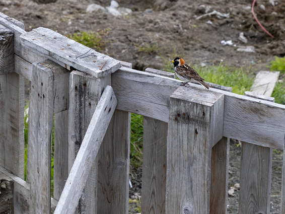 A Lapland longspur on a pallet fence. There are no trees in Greenland